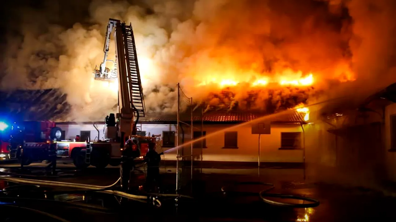 Pompierii încearcă să împiedice extinderea flăcărilor la sala de sport, care se află la câțiva metri apropiere.