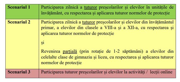 Cele trei scenarii luate în calcul sunt: roşu, galben şi verde, în funcţie de situaţia epidemiologică. Cele trei mari scenarii sunt stabilite în funcţie de numărul de cazuri noi din ultimele 14 zile la mia de locuitori. Anul şcolar 2020-2021 începe pe 14 septembrie.