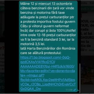 „Câteva benzinarii din ţară vor vinde benzina și motorina fără taxe adăugate la preţul carburanţilor pentru a protesta împotriva fostului guvern Cîțu și viitorul guvern neformat încă (dar corupt și ăsta 100%). Astfel, între orele 12-18, prețul carburanţilor va fi la benzină standard 3 lei, iar la motorină 3,5 lei”, scrie în mesajul distribuit zilele trecute pe rețelele sociale, potrivit publicației Replica de Constanța.