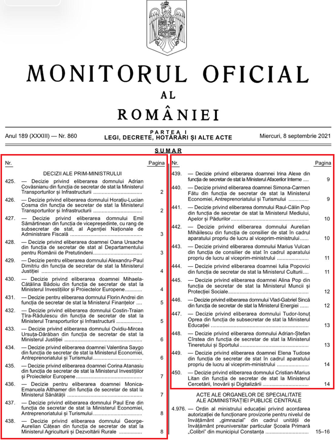 În Monitorul Oficial al României – 8 septembrie 2021 – au fost publicate nu mai puțin de 26 (425 – 450) de decizii ale premierului de atunci al României, Florin Cîțu.