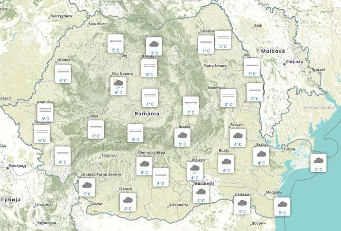 Temperaturile de azi se vor încadra între 4 și 10 grade, ușor mai ridicate în vestul Olteniei și sudul Banatului, unde cerul va fi mai degajat spre orele amiezii. Temperaturile minime vor fi cuprinse între minus 3 și 4 grade.