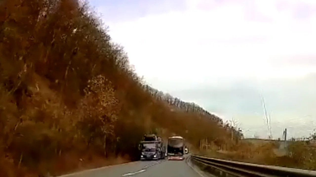 Incidentul a avut loc în zona localității Zam, din județul Hunedoara, când șoferul autocarului a intrat într-o depășire neregulamentară a unui autotractor care transporta autoturisme.