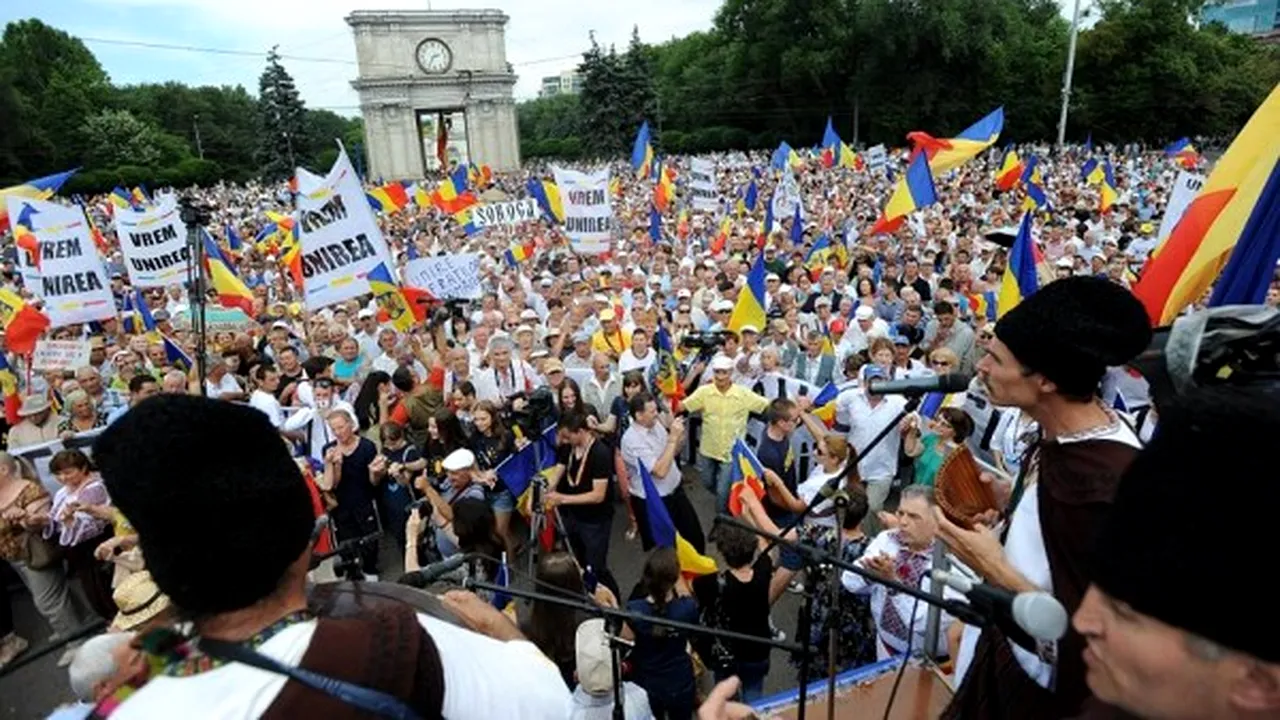 Demonstranții scandează „Trăiască, trăiască, trăiască, Moldova, Ardealul și Țara Românească!” și „Unire!”, potrivit publika.md.