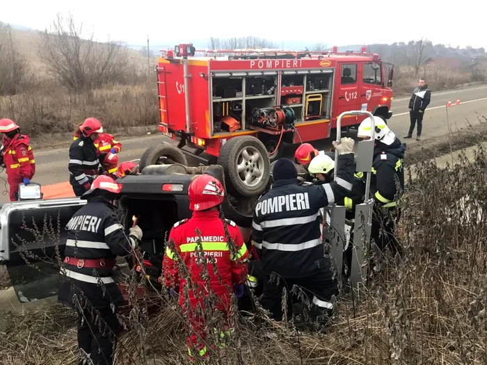 Victima blocată a fost extrasă, echipajele medicale evaluează victimele la fața locului, ambele victime sunt conștiente, cooperante.