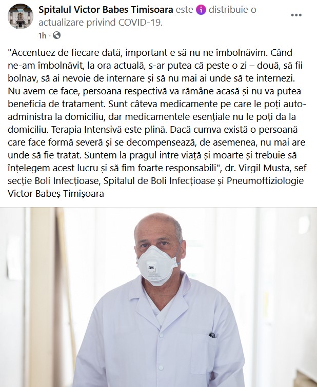 Mesaj de ultimă oră al medicului Virgil Musta, șeful secție de Boli Infecțioase a Spitalului „Victor Babeș” din Timișoara: locurile la terapie intensivă sunt pline!