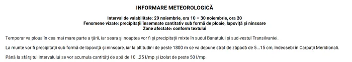 Meteorologii ANM au transmis și o informare meteorologică, valabilă până în data de 30 noiembrie, la ora 20:00.