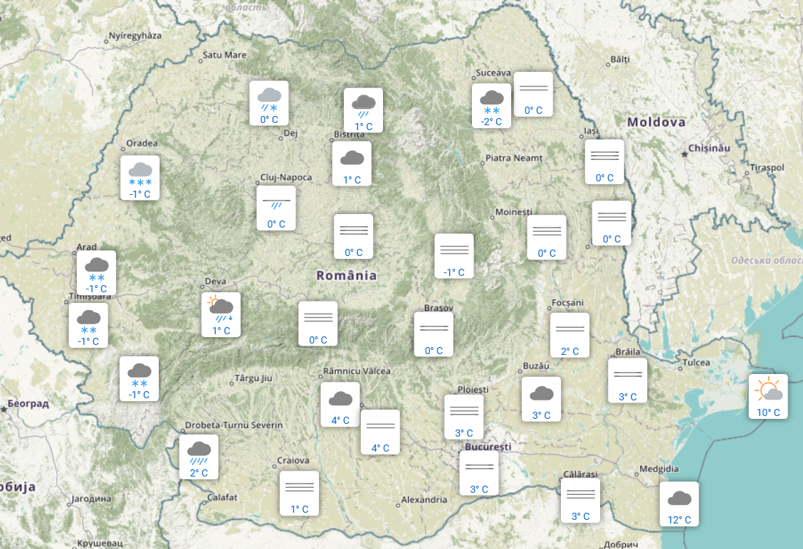 A fost lapoviță la Baia Mare – și 0 grade Celsius – la aceeași oră a dimineții, conform informațiilor publicate de ANM, în timp ce în Moldova, la Botoșani, Iași și Vaslui, termometrele au arătat tot 0 grade.