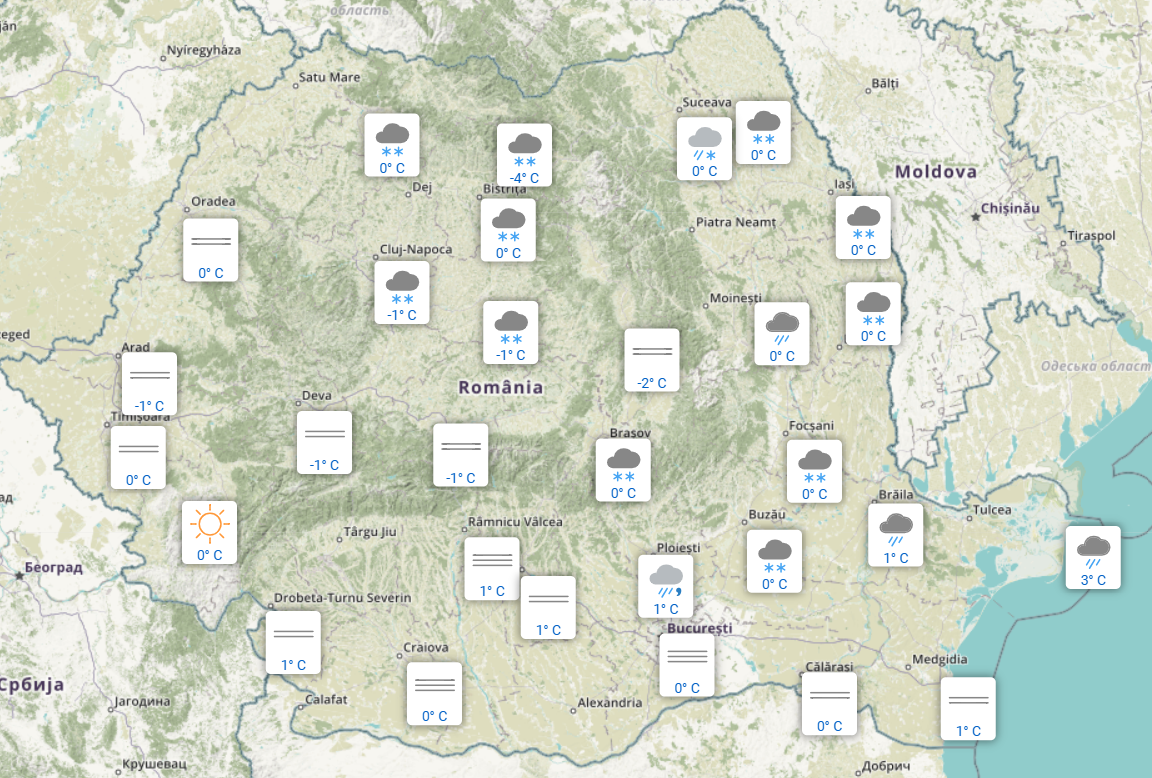 În același timp, vor mai fi și unele intensificări ale vântului, doar în sudul Banatului, iar maximele termice ale zilei de astăzi vor fi de la minus 1 grad la 0 grade în nordul Moldovei și în Transilvania până la 7-8 grade în zonele din Banat și Crișana.