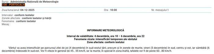 • Interval de valabilitate: 4 decembrie, ora 10 – 6 decembrie, ora 22