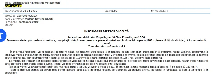 În nordul Carpaților Orientali, treptat vor predomina ninsorile și se va depune strat de zăpadă, în general de 5-10 cm, iar precipitații mixte vor fi la altitudini mari și în restul zonei montane și posibil – spre sfârșitul intervalului – în nord-vestul Moldovei și estul Transilvaniei.