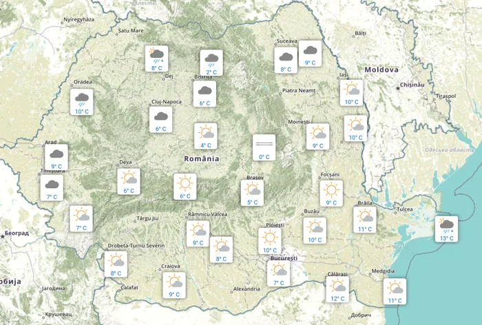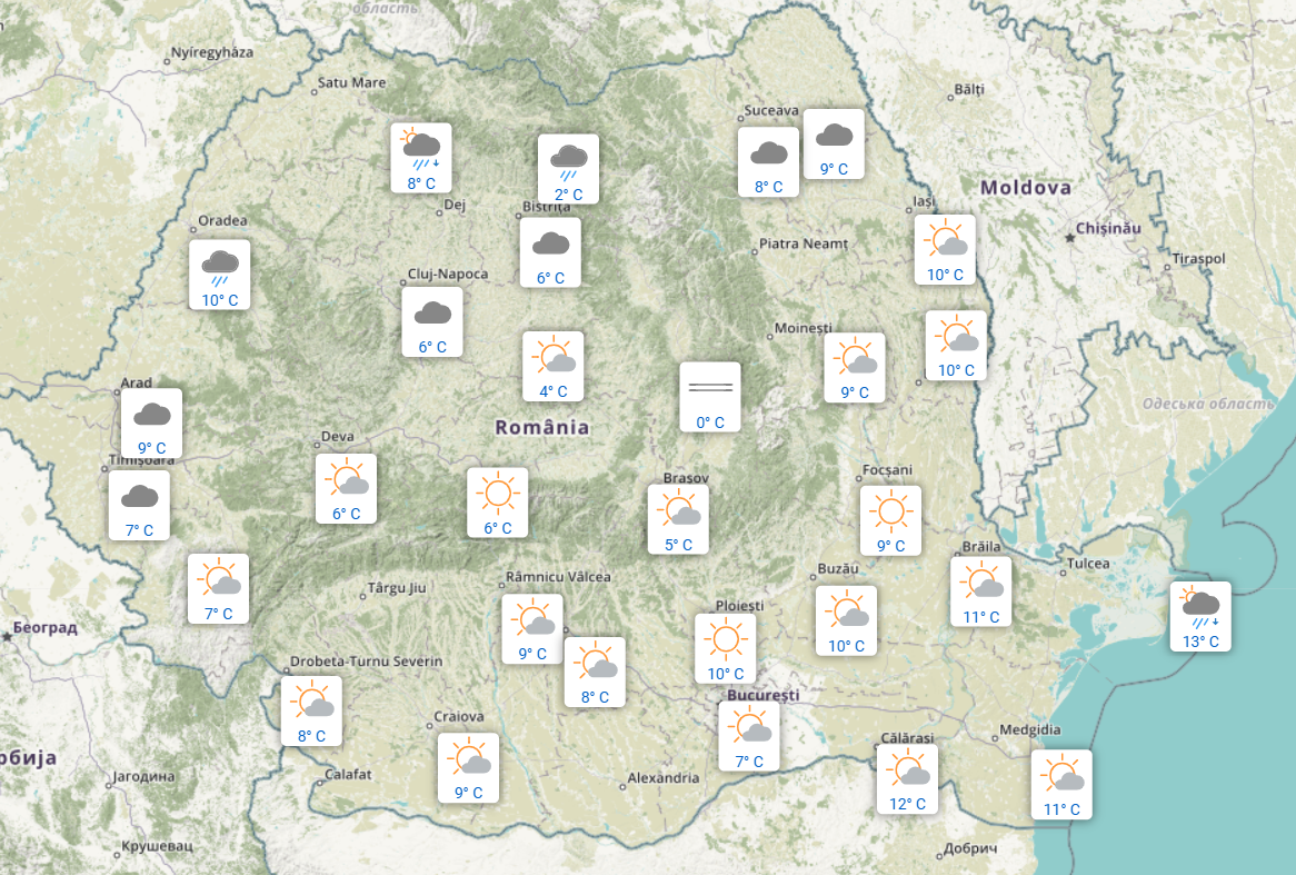 Potrivit ANM, la ora 08:00, cea mai scăzută temperatură din țară s-a înregistrat la Miercurea Ciuc – 0 grade Celsius.