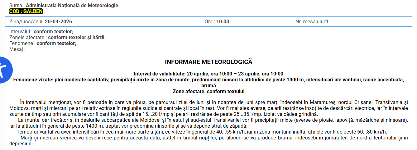 La început de săptămână, încă nu sunt avertizări emise de meteorologii Administrației Naționale de Meteorologie (ANM). Vremea se menține, deocamdată, frumoasă, iar temperaturile sunt în limitele normale pentru această perioadă a anului.