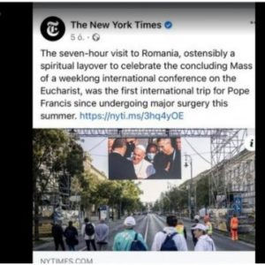 „Budapesta nu este București. Dacă cineva va dori să se refere în viitor la New York Times ca la o sursă credibilă de informații, să nu uităm că potrivit paginii de Facebook a acestei publicații, pagină cu 17 milioane (!) de urmăritori, Papa Francisc a fost ieri în România. Și asta nu e o glumă!”.