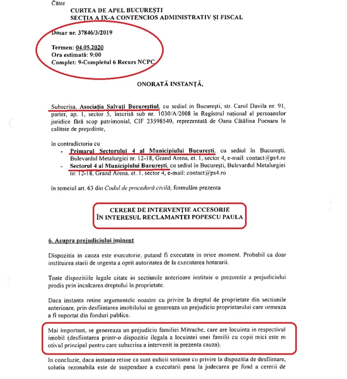 „Considerăm că Dispoziţia nr. 3339/02.12.2018 emisă de Primarul Sectorului 4 al Municipiului Bucureşti este ilegală şi aduce atingere calităţii locuirii reclamantei. (…) Se generează un prejudiciu familiei Mitrache, care are locuința în respectivul imobil (desființarea printr-o dispoziție ilegală a locuinței unei familii cu copii mici este motivul principal pentru care subscrisa a intervenit în prezența cauză)”, se arată în cererea de intervenție accesorie a Asociației „Salvați Bucureștiul”.