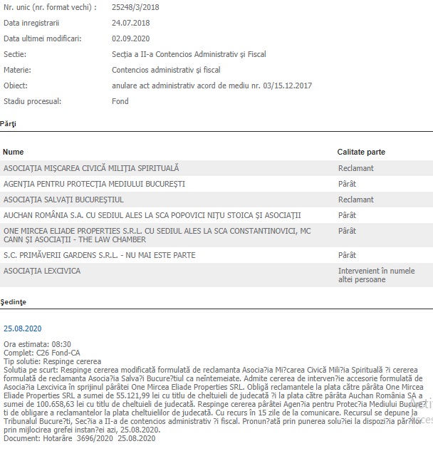 „Respinge cererea modificată formulată de reclamanta Asociația Mișcarea Civică Miliția Spirituală și cererea formulată de reclamanta Asociația Salvați Bucureștiul ca neîntemeiate. Admite cererea de intervenție accesorie formulată de Asociația Lexcivica în sprijinul pârâtei One Mircea Eliade Properties SRL. Obligă reclamantele la plata către pârâta One Mircea Eliade Properties SRL a sumei de 55.121,99 lei cu titlu de cheltuieli de judecată și la plata către pârâta Auchan România SA a sumei de 100.658,63 lei cu titlu de cheltuieli de judecată. Respinge cererea pârâtei Agenția pentru Protecția Mediului București de obligare a reclamantelor la plata cheltuielilor de judecată. Cu recurs în 15 zile de la comunicare. Recursul se depune la Tribunalul Bucure?ti, Sec?ia a II-a de contencios administrativ și fiscal. Pronunțată prin punerea soluției la dispoziția părților prin mijlocirea grefei instanței azi, 25.08.2020.Document: Hotarâre 3696/2020 25.08.2020”, se arată pe portalul just.ro.