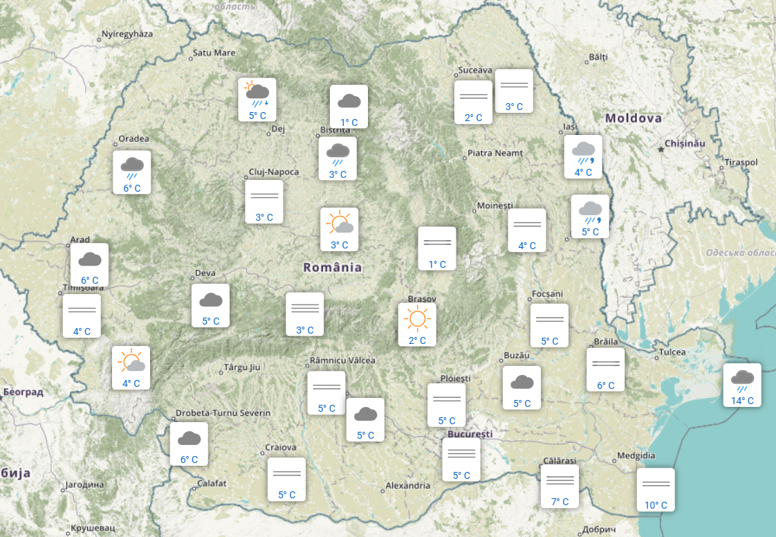 Dacă la Miercurea Ciuc și Iezer era minus un grad, la ora 07:00, locuitorii din Sulina au avut parte de 14 grade. Nu a lipsit, însă, nici ploaia.