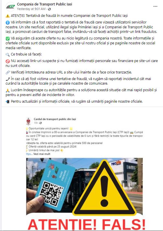 CTP Iași a informat cetățenii despre frauda care circulă în numele companiei / sursă foto: Facebook