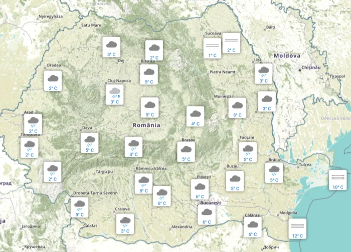 În Moldova, la ora 07:00, a plouat la Iași, acolo unde au fost 3 grade Celsius. Au fost 2 grade la Botoșani și 1 grad la Suceava, iar cerul era cețos.