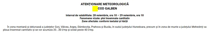 A fost emisă o nouă atenționare meteorologică, cod galben, valabilă până mâine dimineață la ora 10”, a precizat, pentru Gândul, Oana Păduraru – meteorolog de serviciu al ANM.
