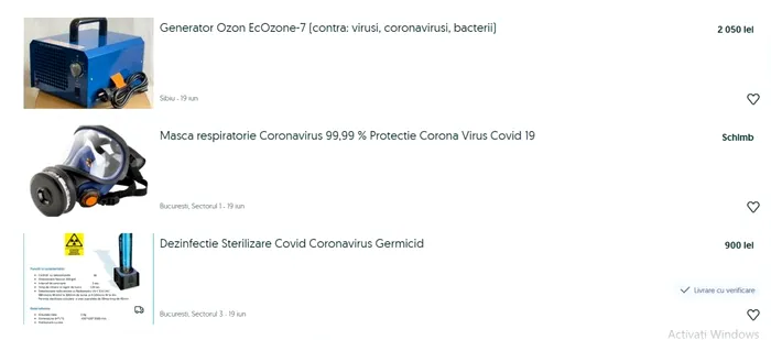 Spre exemplu cineva vinde „un test” la prețul de 47 de lei bucata, asta dacă cumperi 25 de cutii. Altcineva vinde „purificator sterilizator de aer testat contra covid 19”, la prețul de 3.000 de lei și „aparat aburi anti coronavirus netezit haine” cu prețul de 550 lei.