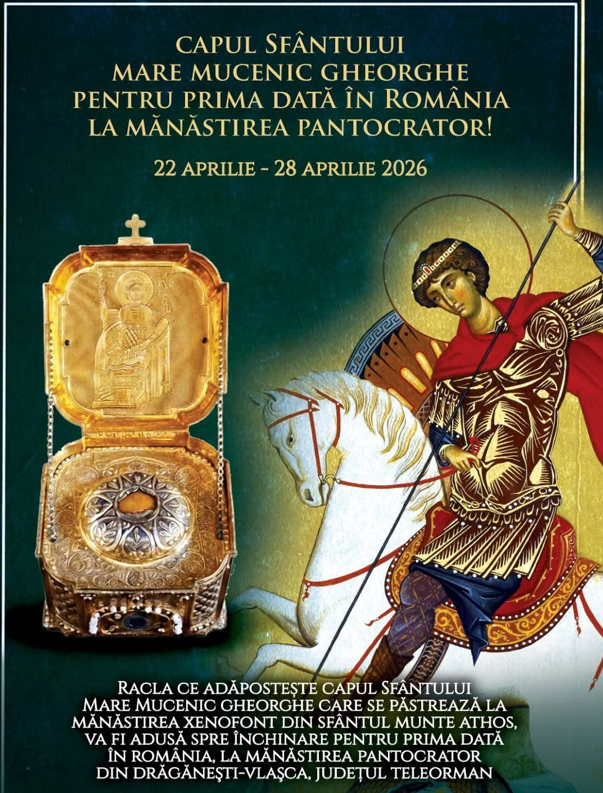 În perioada 22-28 aprilie 2026 va avea loc un pelerinaj istoric în România. Capul Sfântului Mare Mucenic Gheorghe, păstrat la Muntele Athos, în Mănăstirea Xenofont, va fi adus pentru prima oară în România, la Mănăstirea Pantocrator din Drăgănești-Vlașca, județul Teleorman.