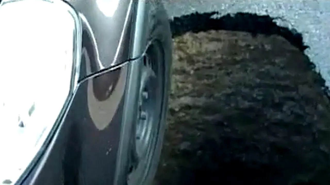 Asfaltul s-a surpat chiar sub mașină și s-a format o groapă adâncă de 2 metri. Norocul șoferiței a fost că groapa nu a fost destul de mare, cât să cadă tot autoturismul în ea.