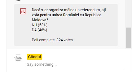 Cei mai mulți dintre respondenți (53%), NU ar fi de acord ca România să se unească cu Republica Moldova, în timp ce 46% dintre aceștia au dat un răspuns pozitiv.