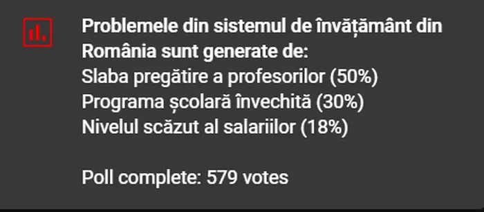 Întrebarea poll-ului din această seară de la emisiunea ”Marius Tucă Show” a fost legată de sistemul de învățământ din România, telespectatorii având de ales din trei variante de răspuns. Iată cum au răspuns românii: