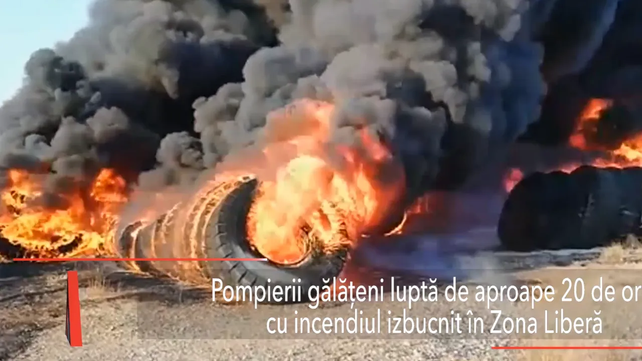 Pompierii gălățeni încearcă de mai bine de 20 ore să stingă incendiul izbucnit pe terenul Zonei Libere Galați. Focul a distrus un depozit de cauciucuri utilizate în industria minieră, iar intervenția pompierilor a fost îngreunată de fumul foarte gros.