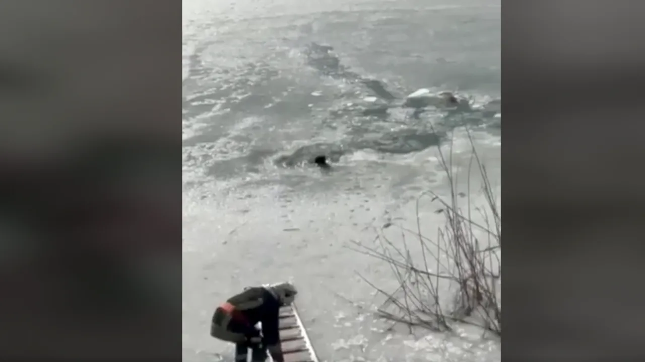 Patrupedul se plimba în albia râului, iar gheața subțire s-a rupt și cățelul a căzut în apă.