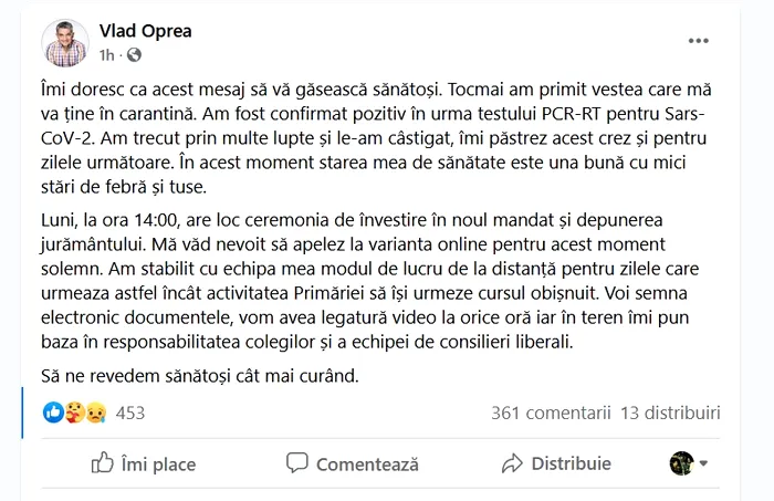 Să ne revedem sănătoși cât mai curând.”, se arată în mesajul primarului, pe rețeaua de socializare.