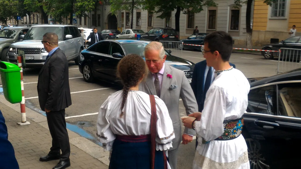 Alteța Sa Regală Charles a fost servit cu pâine și sare de doi studenți îmbrăcați în costume populare.