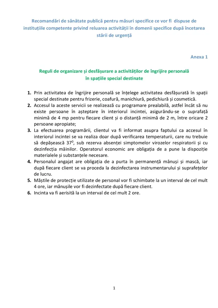 Institutul Național de Sănătate Publică (INSP) propune, în draftul de recomandări referitoare la reluarea activității de către centrele de înfrumusețare, ca accesul în saloane să se facă pe bază de programare, pentru a nu exista persoane în așteptare în interiorul incintei. Clienților li se va verifica temperatura înainte de a i se permite accesul în salon, incinta va fi aerisită din 2 în 2 ore, iar angajații vor purta echipament de protecție: mască și mănuși, potrivit propunerilor INSP.