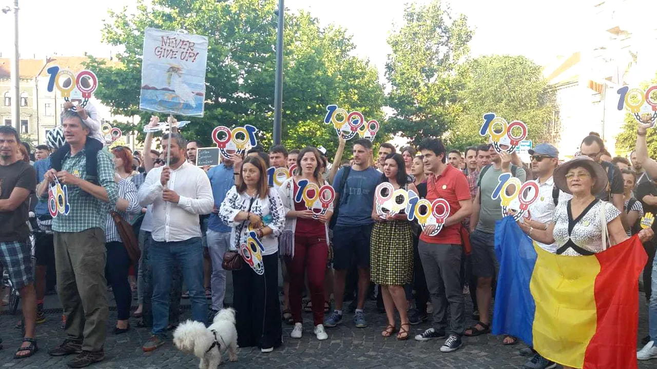 Protestatarii s-au adunat în Piața Unirii din Cluj-Napoca având steaguri tricolore și parcarte cu mesaje precum „Orice om îi e frică de pușcărie„, cu poza premierului Viorica Dăncilă, „Egalite, fraternite, pușcărie”, „Indiferența ucide”, „Dragnea și ai lui, trădătorii neamului”.