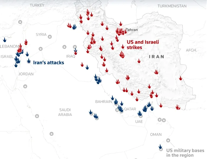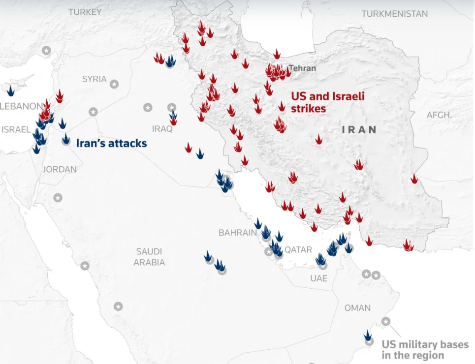 Așa cum era de așteptat, Iranul a răspuns cu atacuri cu rachete și drone cu rază lungă de acțiune împotriva bazelor americane din regiune, Israel și vecinii regionali, în special Bahrain, Kuweit, Qatar, Arabia Saudită și Emiratele Arabe Unite. Țintele au inclus infrastructură militară și civilă, precum și centre populate.