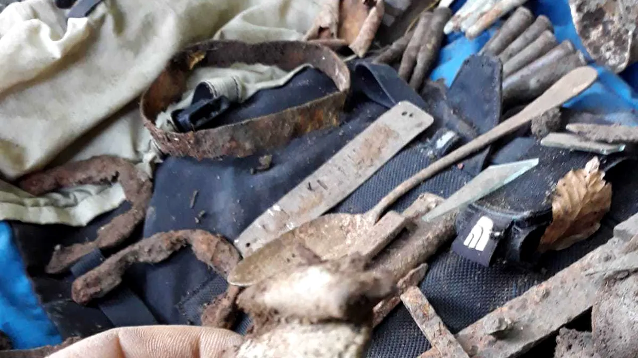 Au fost găsite mai multe elemente de muniție, o bucată de lopată și o cască metalică.