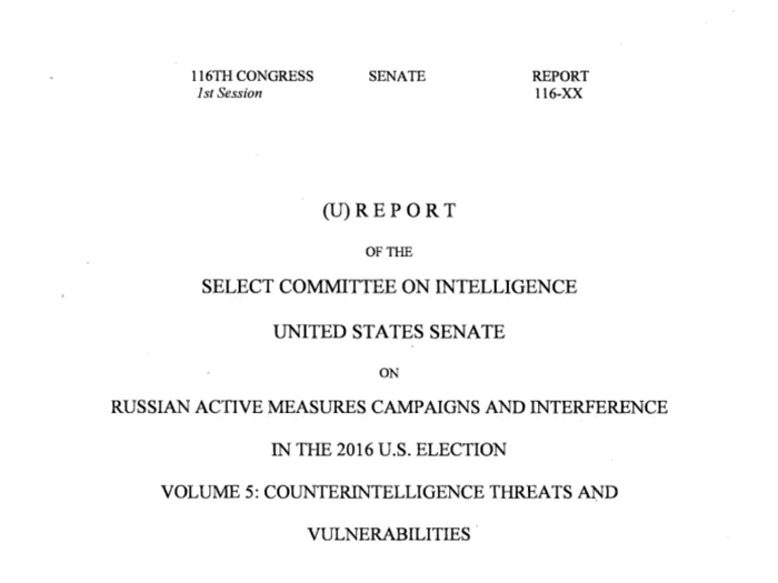 Comisia pentru Informaţii din cadrul Senatului SUA a făcut public, marţi, al cincilea volum și ultimul, al raportului privind interferenţele ruse în scrutinul prezidenţial desfăşurat în SUA în 2016.