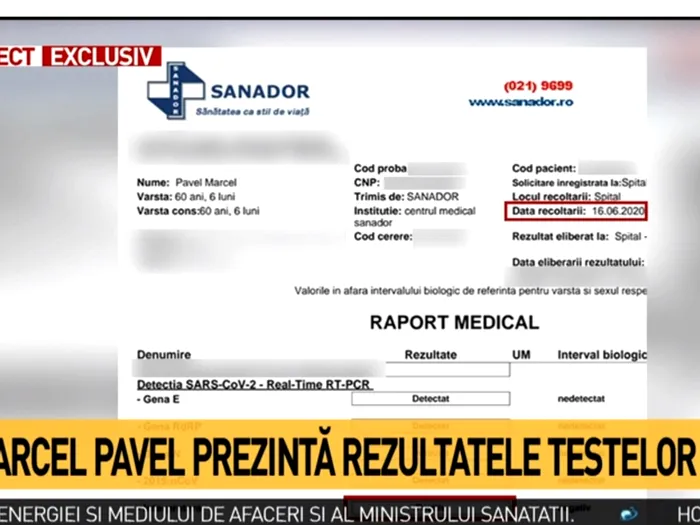 „Sunt siderat, am fost afectat, foarte supărat. Eu sunt cu coloană vertebrală dreaptă, nu fac jocurile politice ale nimănui, ale niciunei televiziuni. Nu va rămâne aşa totul. Îi voi da în judecată. Le voi cere daune mari şi vreau să vină cu probe”, a spus Marcel Pavel, în emisiunea Sinteza Zilei, prezentând, totodată, în direct, rezultatele testelor pentru COVID-19!