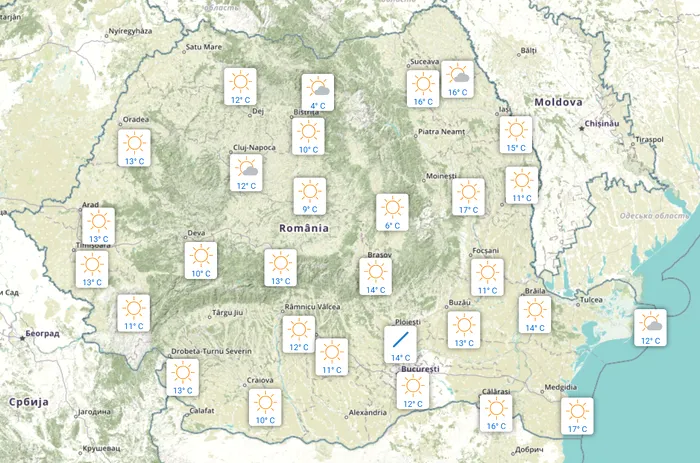 În ceea ce privește regimul termic, va fi unul diferențiat între nordul și sudul țării. În nord, centru și nord-est avem un front atmosferic care va traversa pe parcursul zilei aceste zone, va determina înnorări și ploi slabe, trecătoare, mai ales în zona Moldovei.