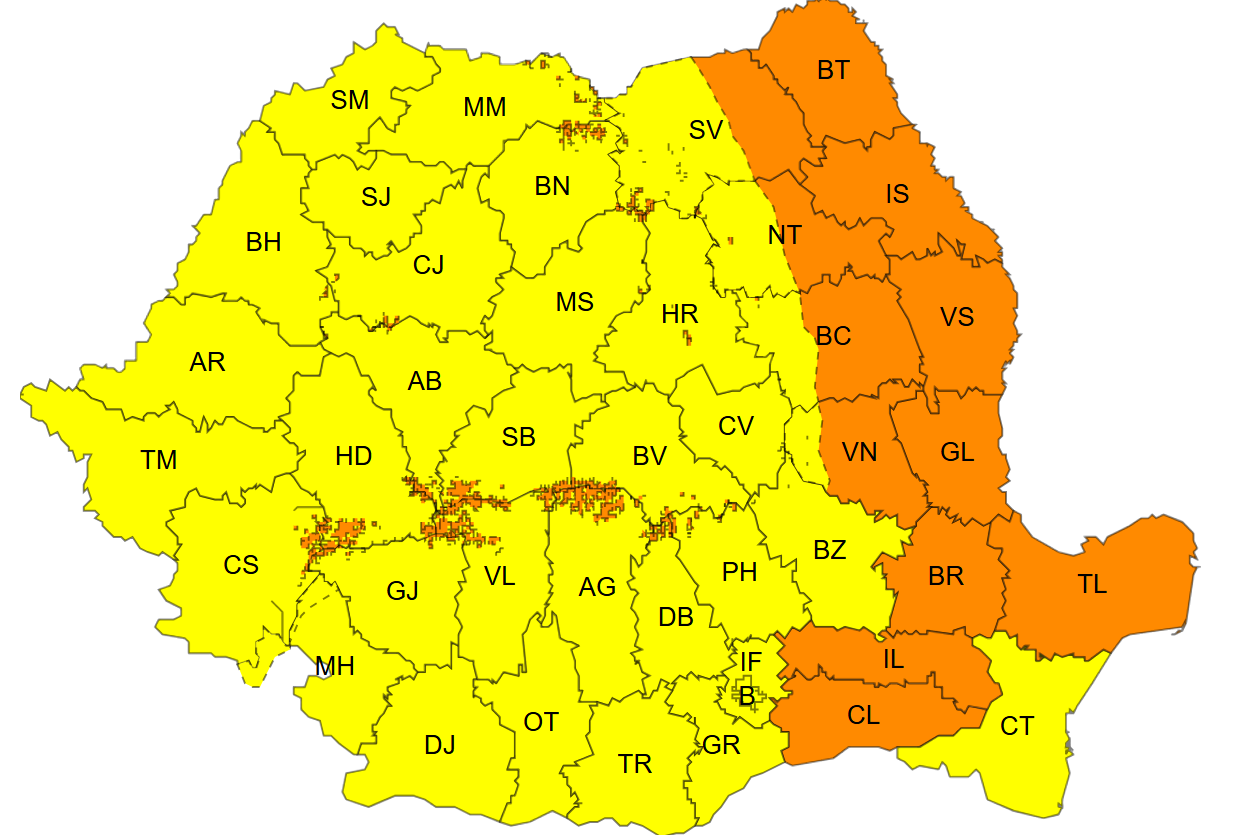 De asemenea, pentru prima parte a nopții, vântul va slăbi intensitate, dar se mai menține un cod galben și portocaliu pentru zona Carpaților Meridionali.