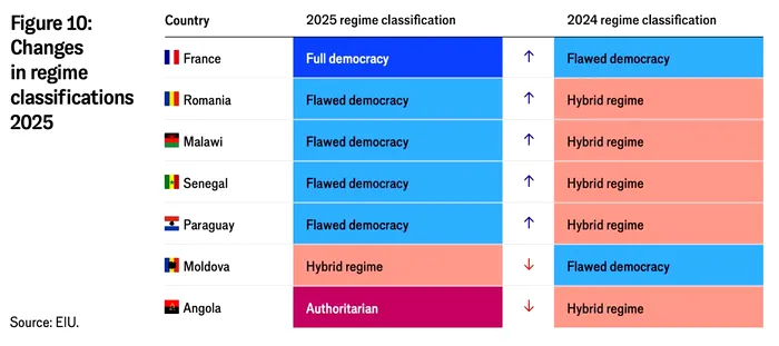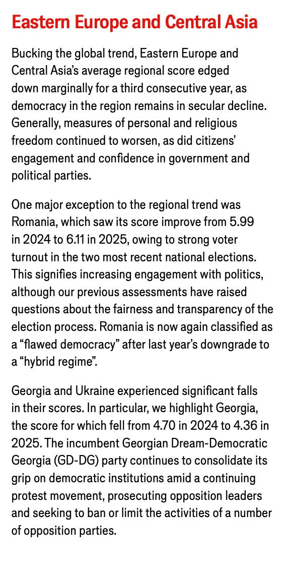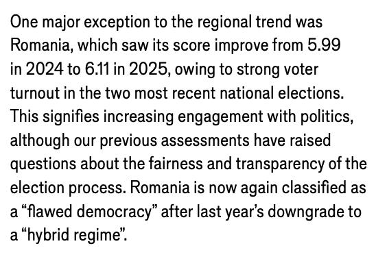 „O excepție majoră de la tendința regională a fost România, al cărei scor s-a îmbunătățit de la 5,99 în 2024 la 6,11 în 2025, datorită prezenței puternice la vot la cele mai recente două alegeri naționale.”