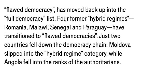 Să pretinzi, în aceste condiții, că 106.483 de alegători în plus (adică 1,11% din numărul celor care au votat) sunt suficienți pentru a transforma un regim hibrid într-o democrație defectuoasă, pare o glumă destul de proastă, din moment ce alți indicatori stabiliți chair de către EIU sunt în vizibil regres. Totul este, însă, să și vrei să vezi acest regres.