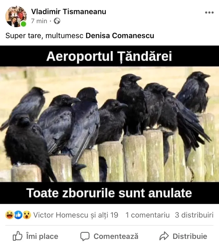 De la ce a pornit tot scandalul: Vladimir Tismăneanu a distribuit o fotografie primită de la scriitoarea Denisa Comănescu, în care apar câteva ciori pe un gard. Poza este însoțită de mesajul „ Aeroportul Ţăndărei. Toate zborurile sunt anulate”.