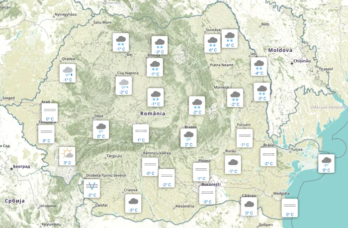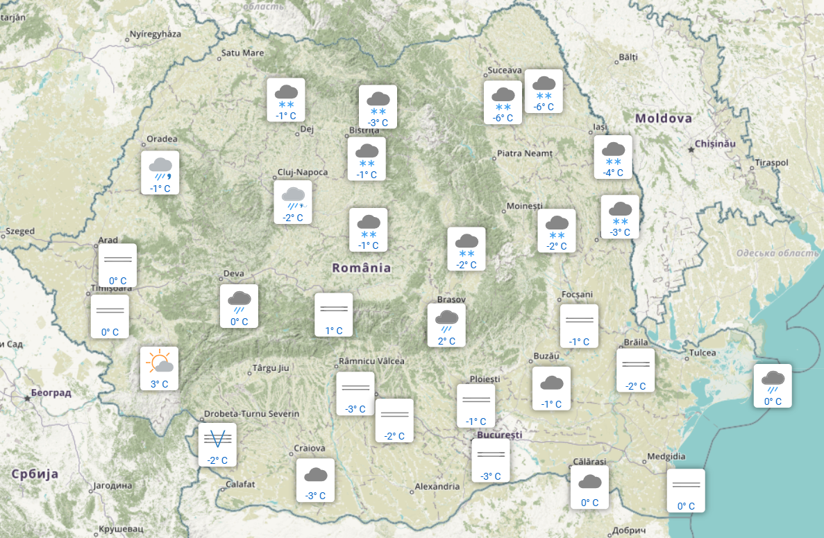În această dimineață, la ora 07:00, potrivit ANM, ningea în partea de nord și nord-est a țării, la Baia Mare, Bistrița, Suceava, Botoșani, Iași, Vaslui, Bacău, Miercurea Ciuc și Târgu Mureș.