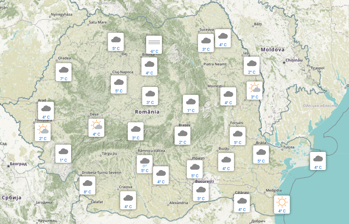În această dimineață, la ora 07:00, cerul a fost acoperit aproape în toată țara, fiind senin doar la Constanța, Vaslui, Timișoara și Deva, potrivit ANM.
