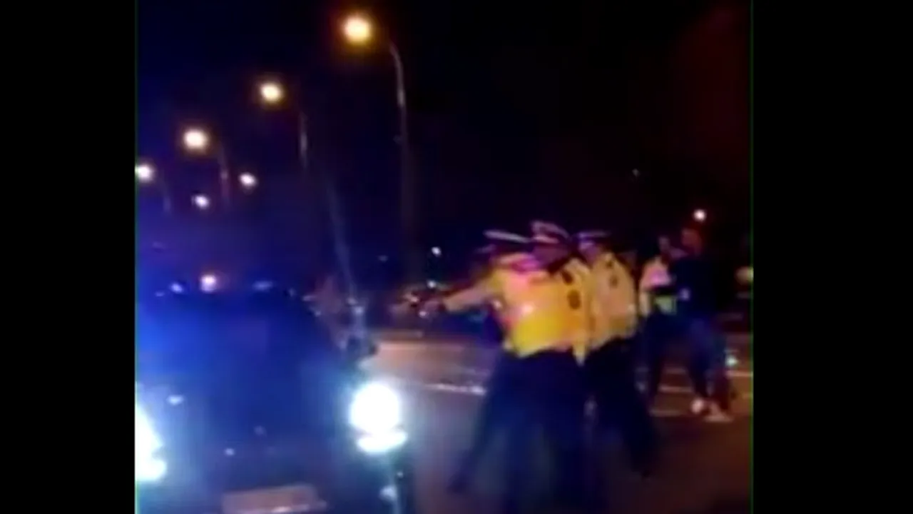„Ulterior, a oprit și, în momentul în care agentul de poliție rutieră i-a solicitat documentele, a devenit agresiv verbal și a demarat, având polițistul agățat de oglinda retrovizoare și de centura de siguranță. Colegul aflat la volanul autospecialei a plecat în urmărirea acestuia, iar polițistul care solicitase documentele a reușit, după aproximativ 20 de metri, să sară de pe mașină. În acest răstimp, a fost solicitat și sprijin din partea altor echipaje de poliție aflate în zonă, care au reușit să blocheze autoturismul. Conducătorul auto a refuzat să coboare, ba mai mult s-a blocat în mașină”, se arată într-un comunicat al Direcției Generale de Poliție a Municipiului București.