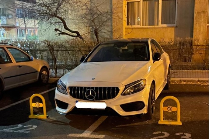 Este cazul unui șofer care a reușit să lase mașina între două locuri marcate și blocate cu sisteme care împiedică ocuparea locurilor.