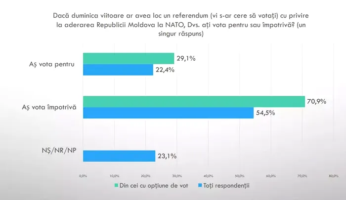 În cazul unui eventual referendum în care s-ar adresa întrebarea: „Ați vota pentru sau împotriva aderării Republicii Moldova la NATO?”, peste 29% dintre respondenți ar răspunde afirmativ.