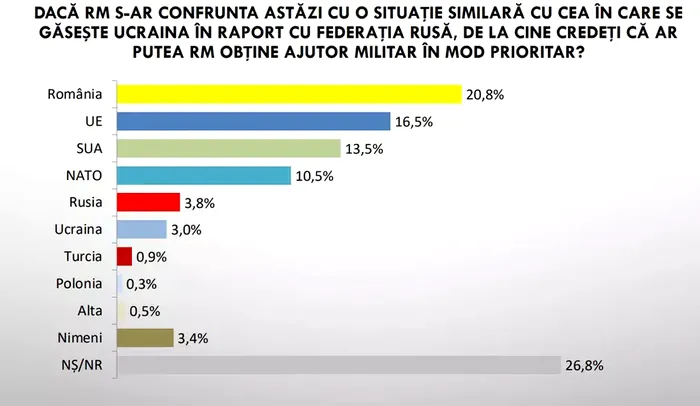 În ipoteza în care Republica Moldova ar fi atacată militar, cel mai mare sprijin ar veni din România (20,8%), UE – 16,5%, SUA – 13,5%, NATO – 10,5% și Rusia – 3,5%.