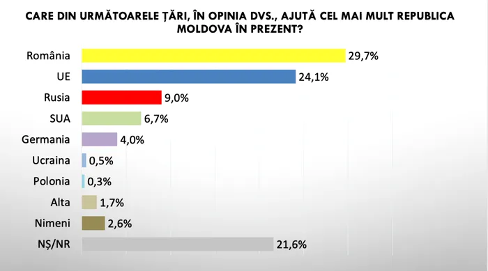 29,7% din respondenții la sondajul realizat de Barometrul socio-politic spun că România ajută cel mai mult Republica Moldova. 24,1% au afirmat că Uniunea Europeană, 9% că Rusia și 6,7% că SUA, arată datele Barometrului socio-politic, un sondaj realizat de CBS Research.